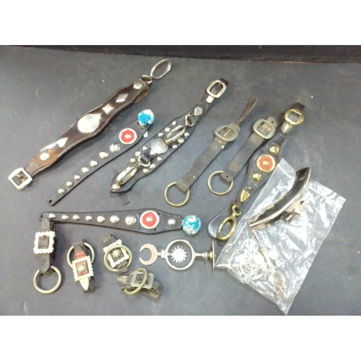 DECORATIVE COLLECTIBLE antique SCOTTISH nickel mounted martingales, one with a maker's stamp such as a Middleton Inchture, some very decorative with other bits and pieces - approx 13 pieces in total, a nice wee haul!
