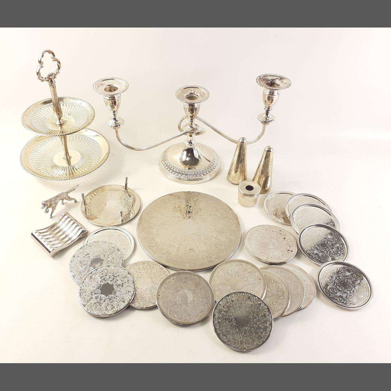 A collection of quality silver plated items to include a cruet set, two sets of coasters, a candelabra, a two tiered and pierced small cake stand etc