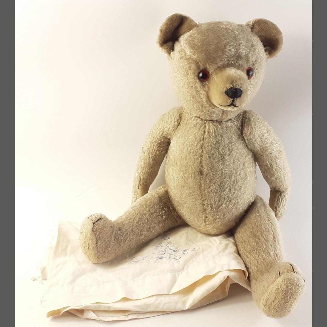 A large and appealing antique teddy bear with indistinct 'Teddy' label. He stands 60cm approx and is in nice condition for his age. Glass eyes and pads all appear original, some wear to mohair in places but he remains lovely and cuddly.