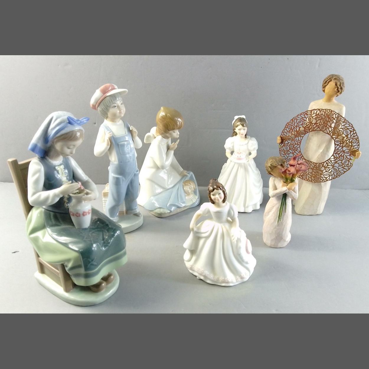 A nice wee collection of ornamental figures to include three NAO two with damage, 2 x ROYAL DOULTON Birthday Girl (HN3423), and Amanda (HN 3635) both in good condition and 2 x WILLOW TREE ornaments Welcome Her and Bloom (one has repair)