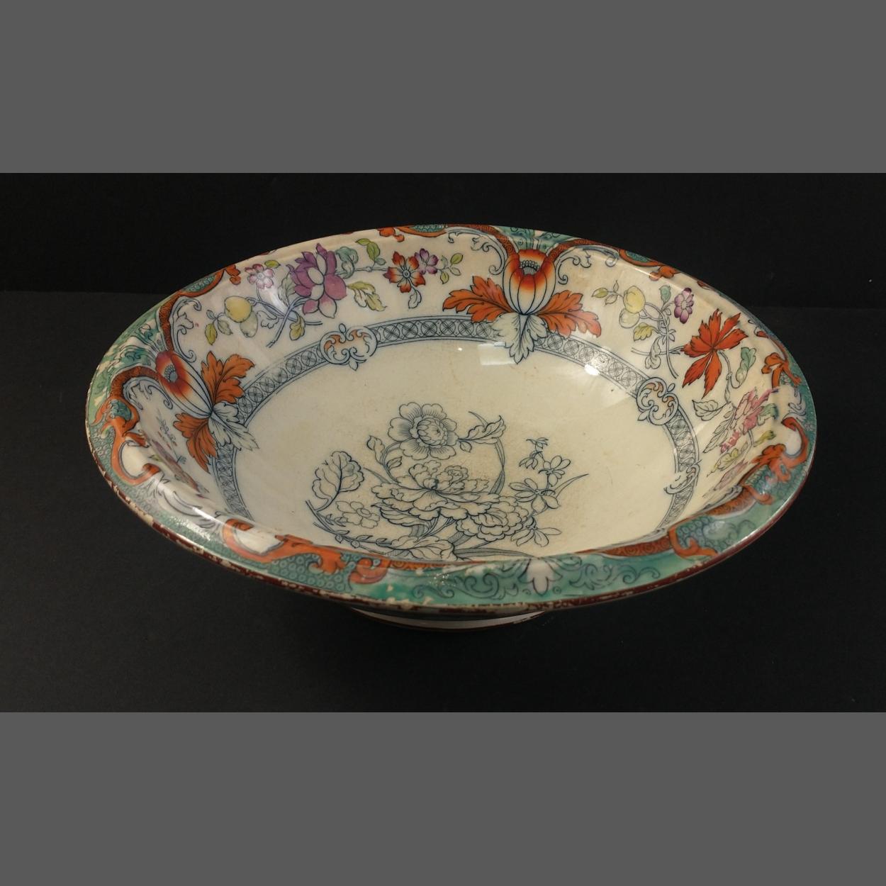 An antique Oriental style bowl with indistinct registration mark to base. Diameter 26cm approx. A few nibbles from edges but generally good condition.