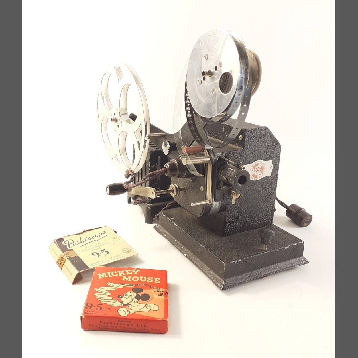 RARE ASTOR pathescope vintage projector includes some vintage reels including Mickey Mouse "MICKEY'S TAXI TROUBLES" 30290 etc