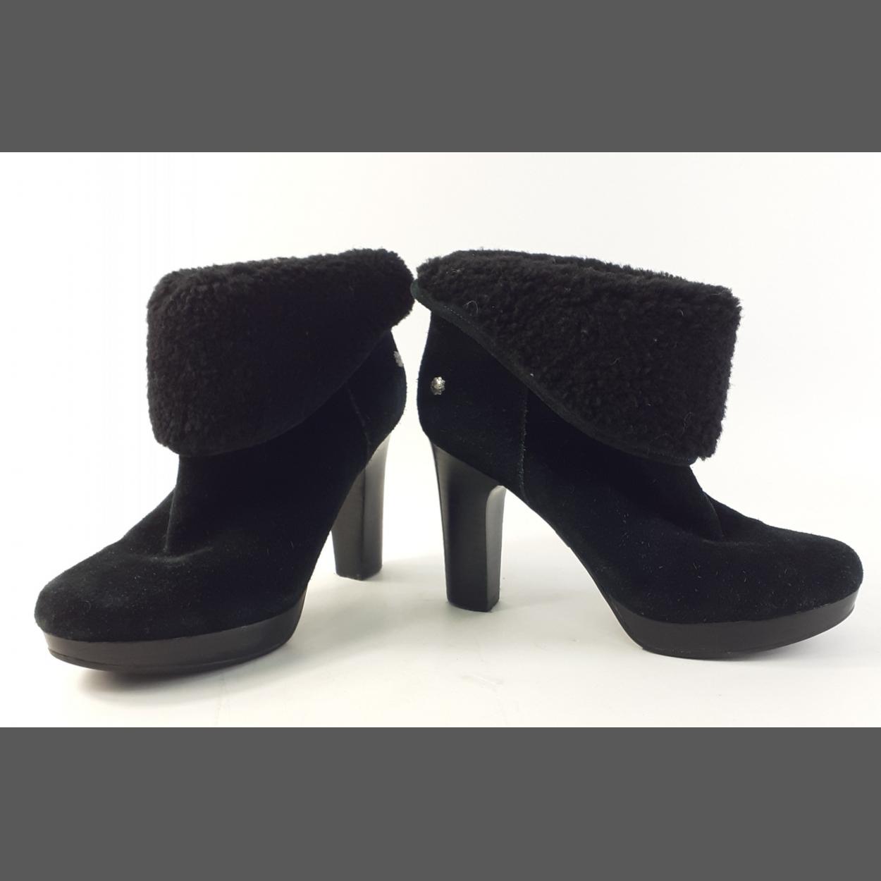A pair of UGG high heeled suede platform ankle boots, UK size 4.5, pull-on style. Slight wear to heel, otherwise unmarked