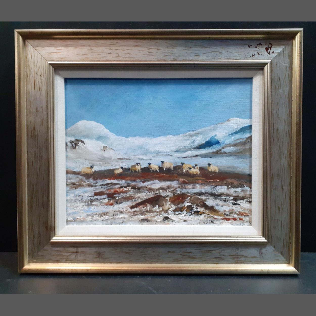BORDERS sheep scene artwork by MARY GOULDING dimensions height 36cm x width 42cm approx