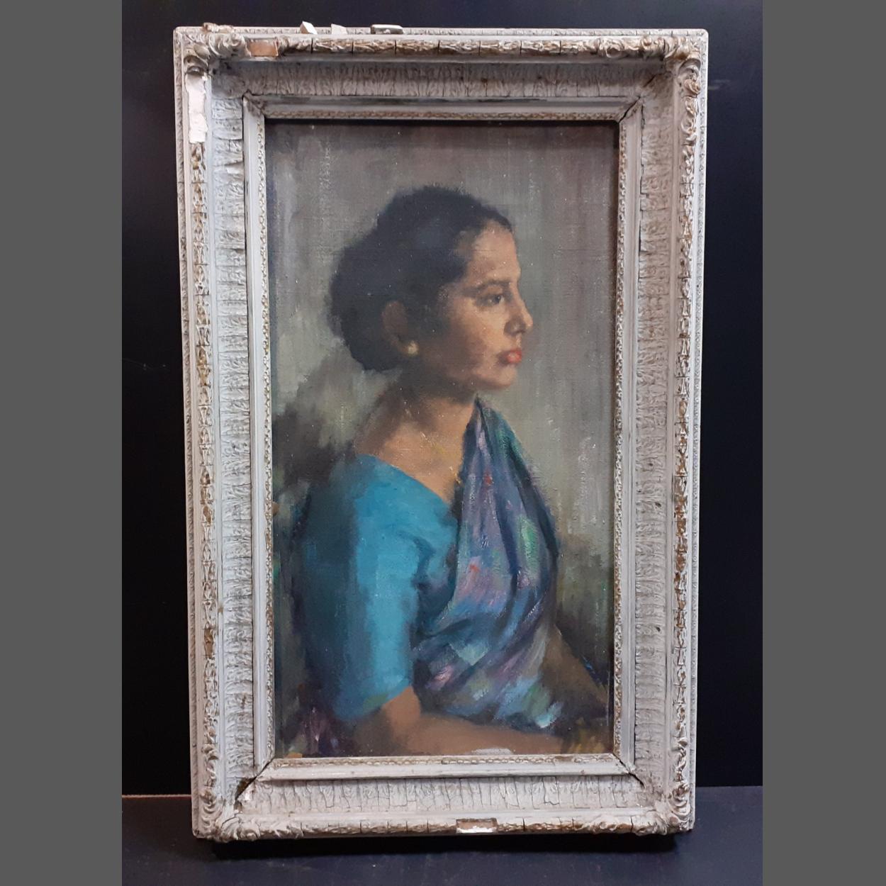 An acrylic on board painting of a stylish Asian woman, frame size 80 x 55cm approx. Frame with damage.