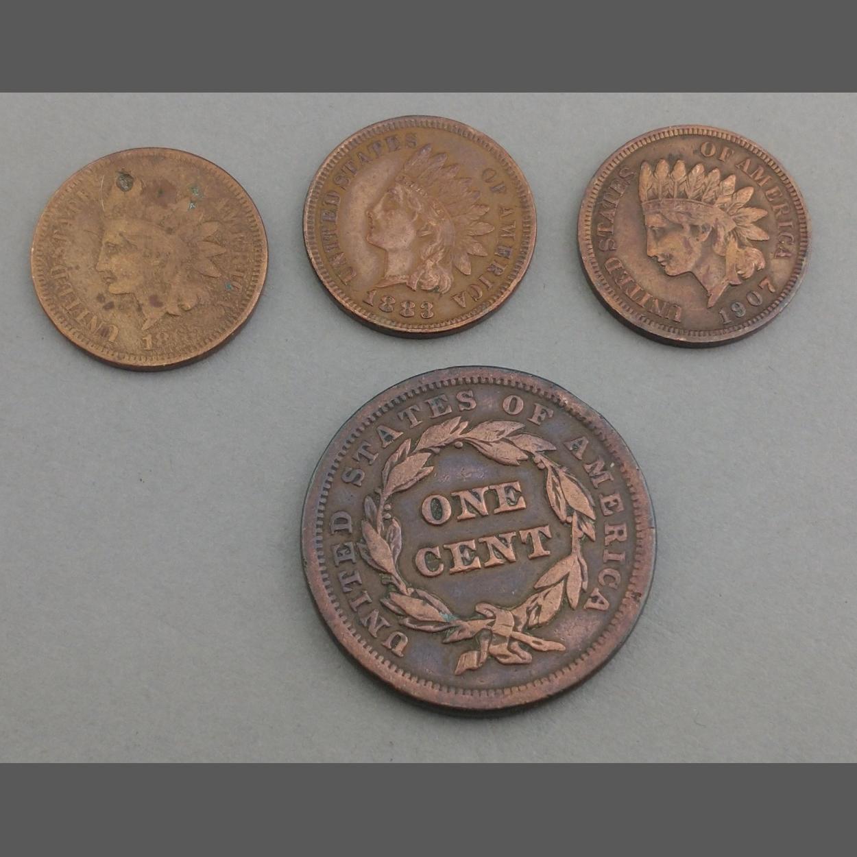 USA Coins of interest. Two very nice American copper coins. 1841 braided hair large cent, wear to high spots as expected but retaining strong detail. A 1907 Indian Head cent in similar grade. An 1883 Indian Head again in nice grade and one other
