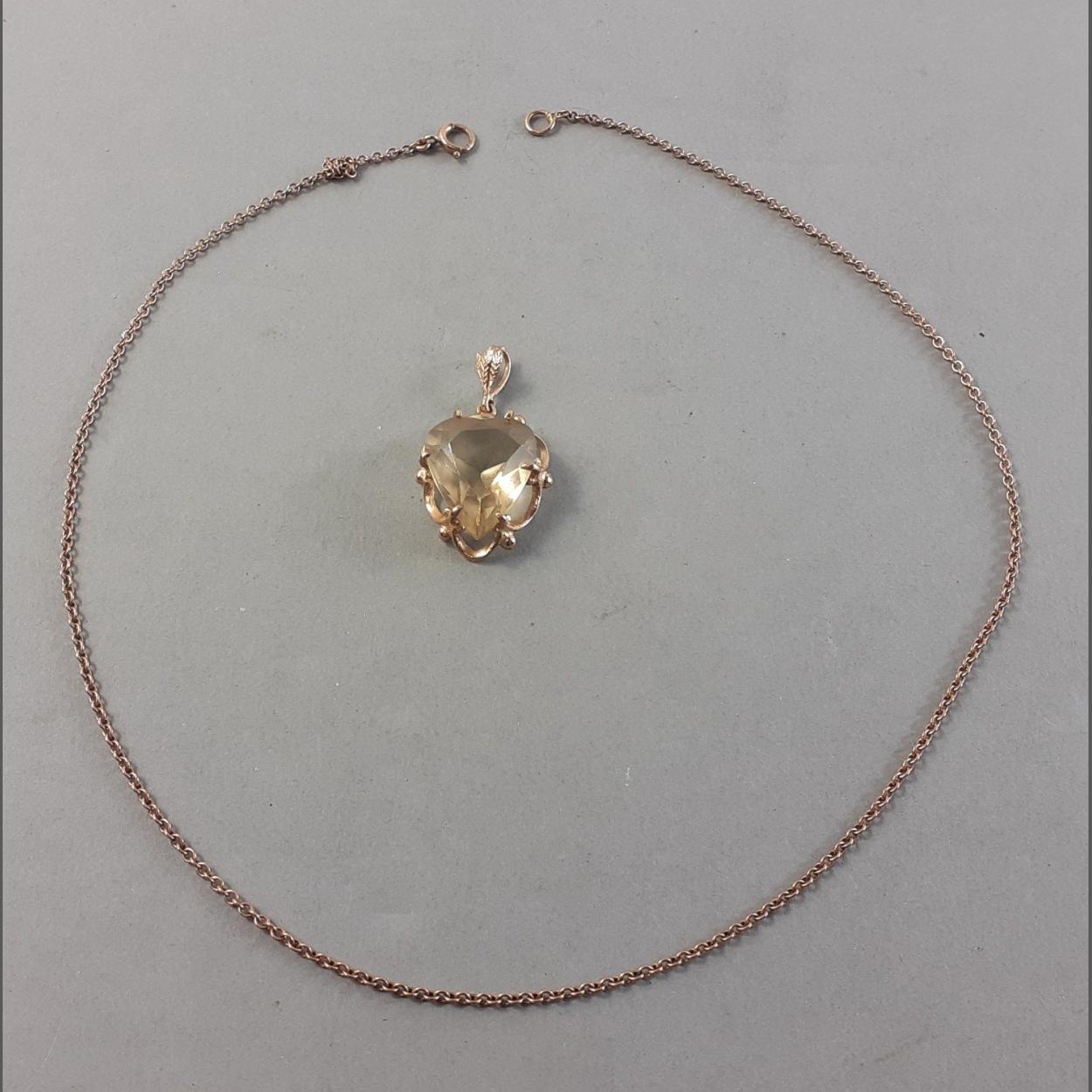 9c stamped neck chain weight 2.32g approx with an unmarked yellow metal pendant with a heart-shaped citrine style stone