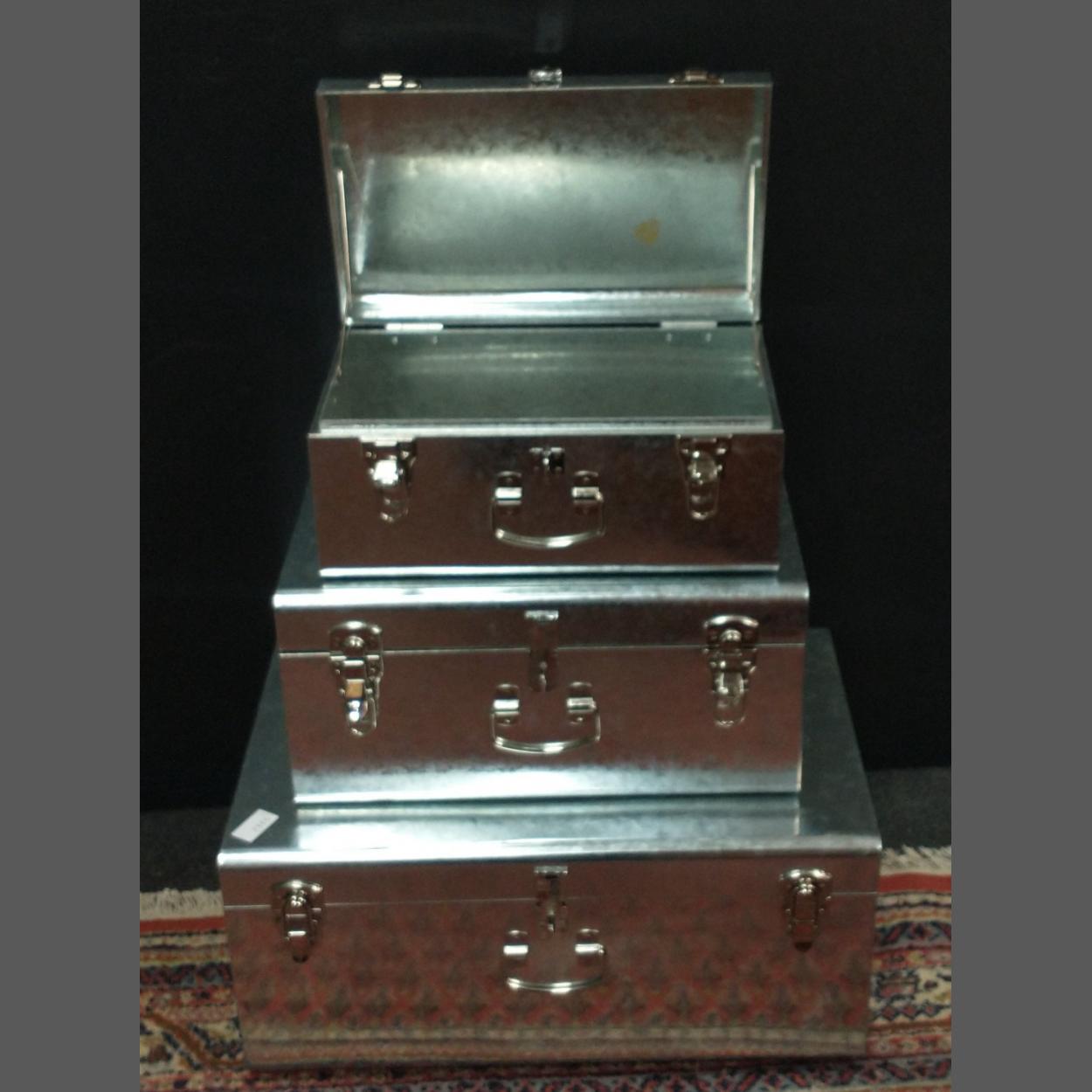 Three graduated metal trunks, largest measuring W56 x H27 x D35cm approx. Two smaller trunks fit neatly inside the largest. Great for storage.