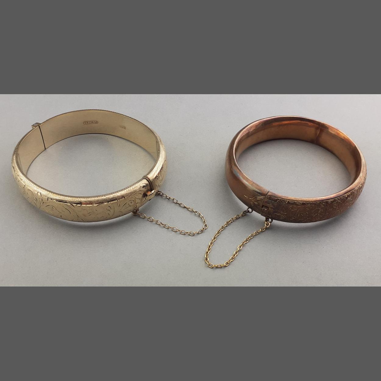 Two vintage gilt finished snap bangles. One marked 1/5 9ct Rolled Gold
