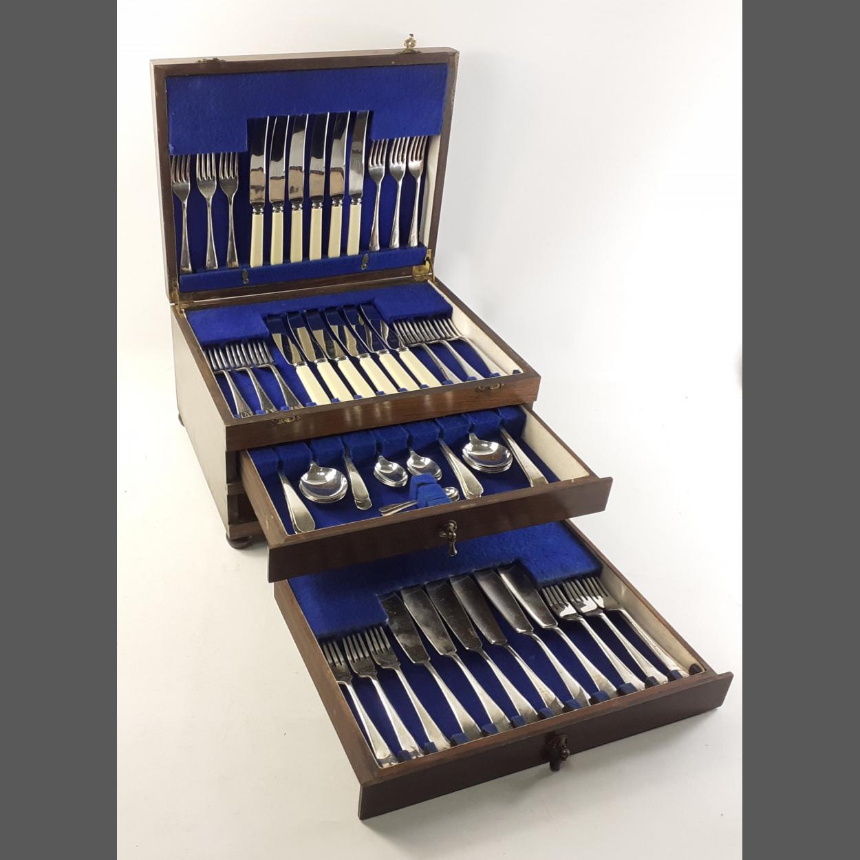 A three level wooden canteen of EPNS cutlery including fish knives and forks, mustard spoons etc