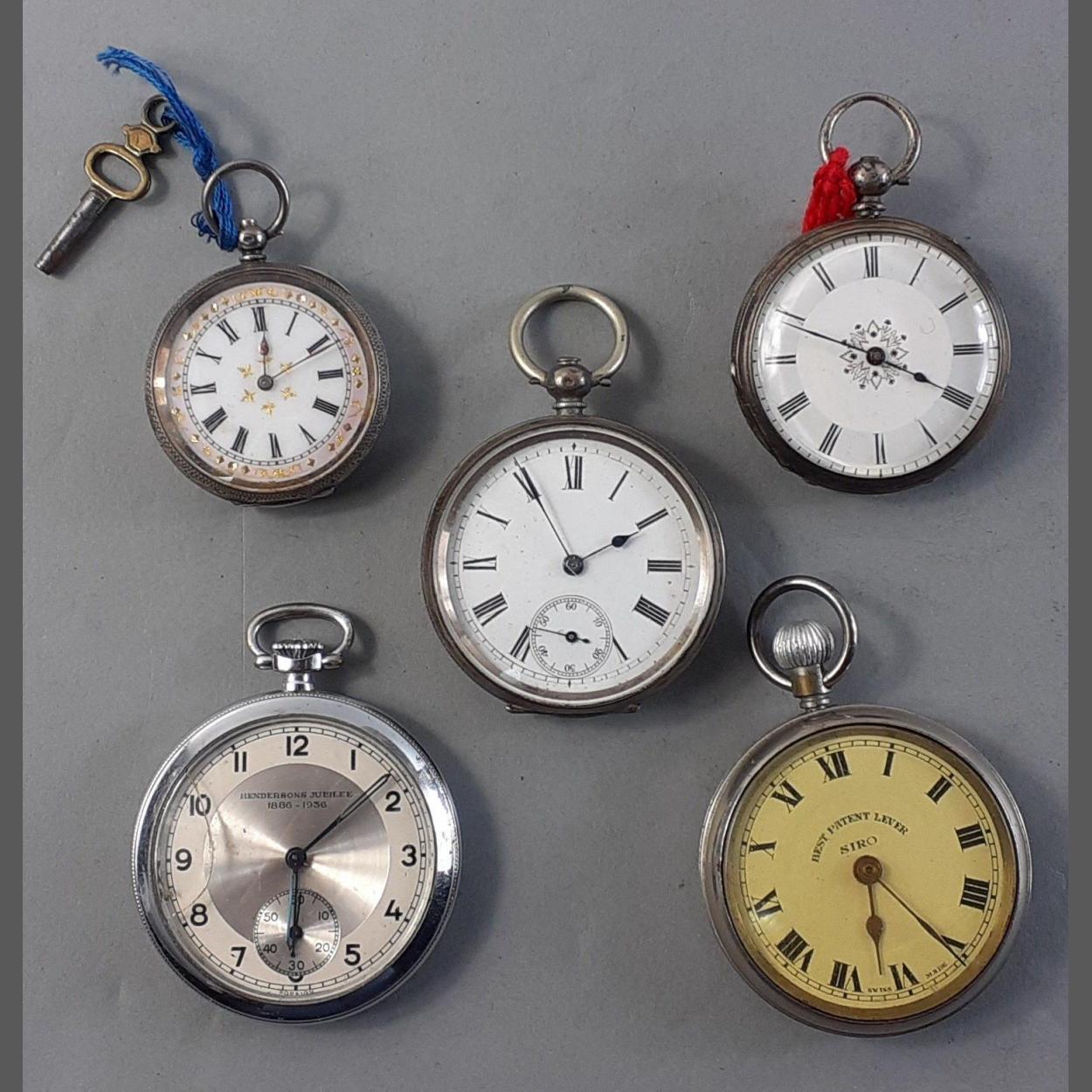 Five assorted pocket watches, non running To include Hendersons Jubilee, Siro and others one with 935 stamped case , and one with 800 stamped case.