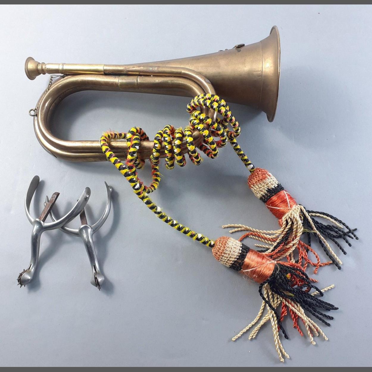 A military brass bugle with artillery badge and a set of vintage cavalry spurs