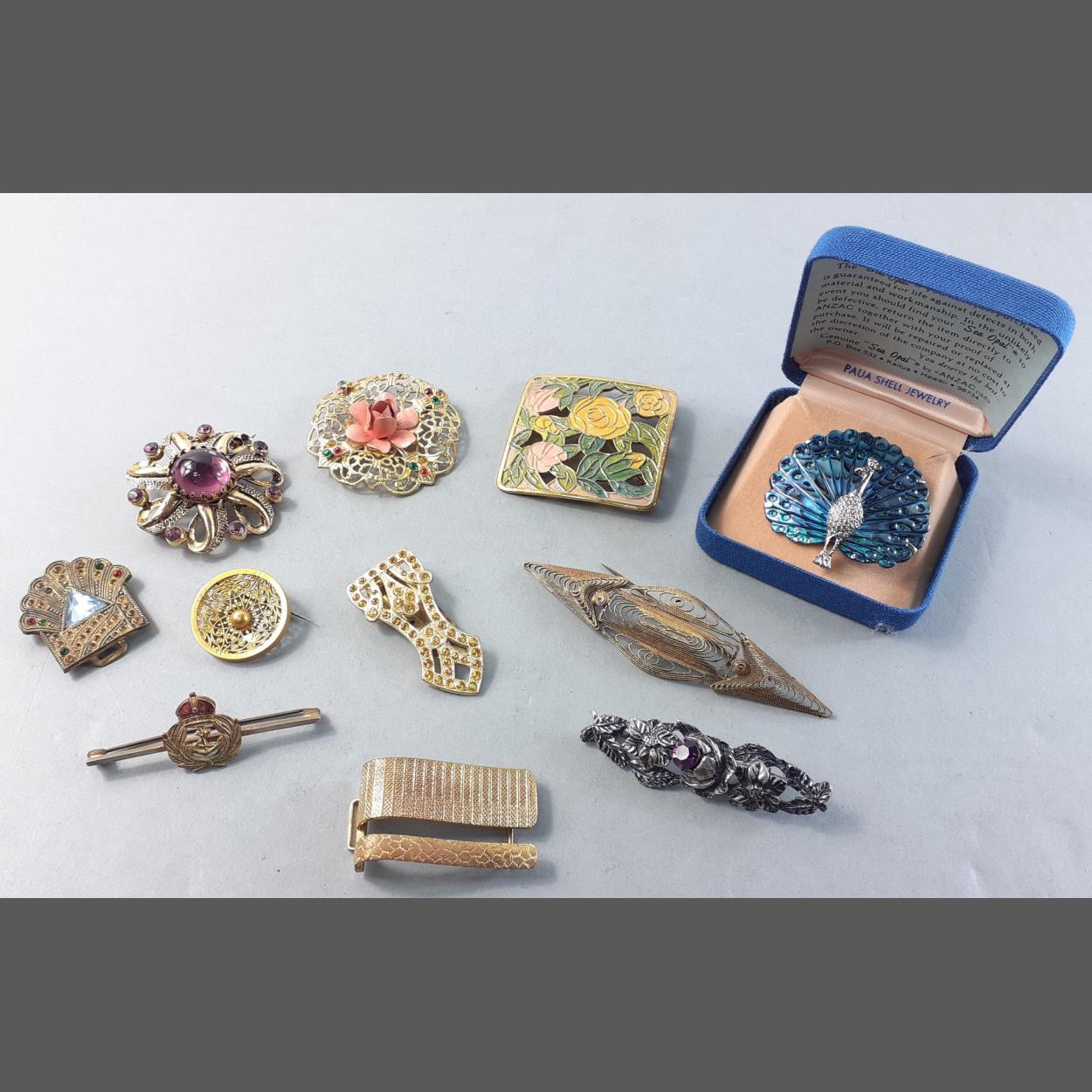 Interesting little lot of gilt jewellery items. Some classy and pretty brooches etc.