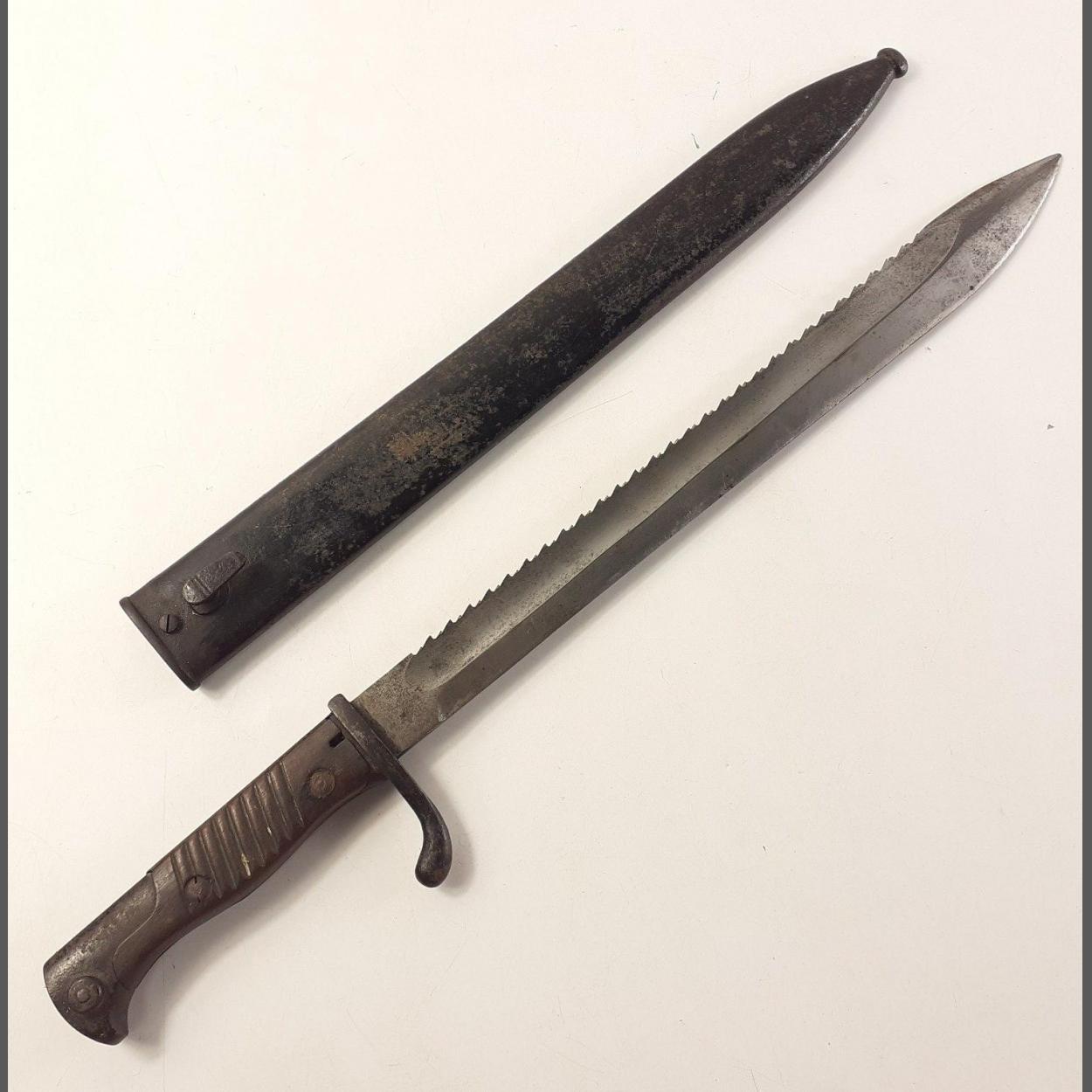A WWI era GERMAN Butcher Sawback bayonet. Stamped Weyersberg , Kirschbaum & Cie Solingen. Blade length 36cm approx. Overall good order.