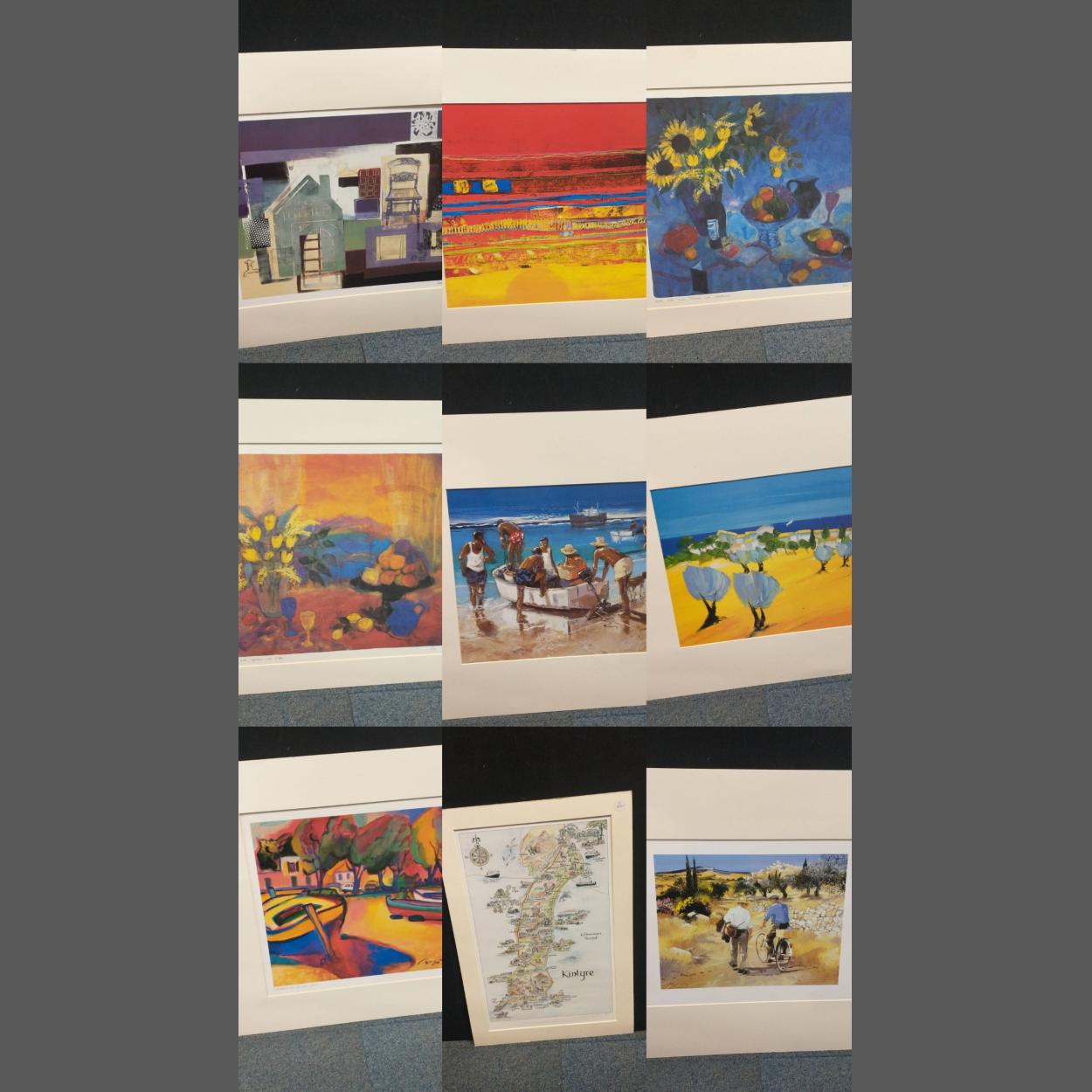 A folder of 20 assorted prints mostly mounted. Mainly large 85 x 66cm approx. Colourful and of good quality. Venice scenes, still life etc.