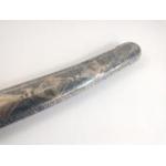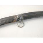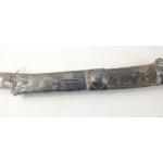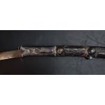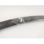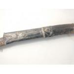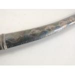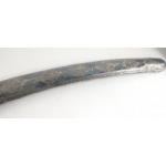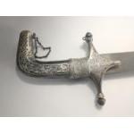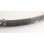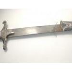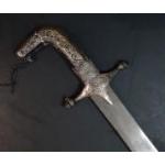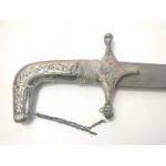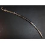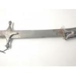 A vintage SHAMSHIR Persian curved sword with silvered metal handle. Blade length 80cm approx. Wear to scabbard and handle. Some rusting noted to blade but very firmly fixed in scabbard. Unable to remove safely from scabbard total gross weight 1270g.