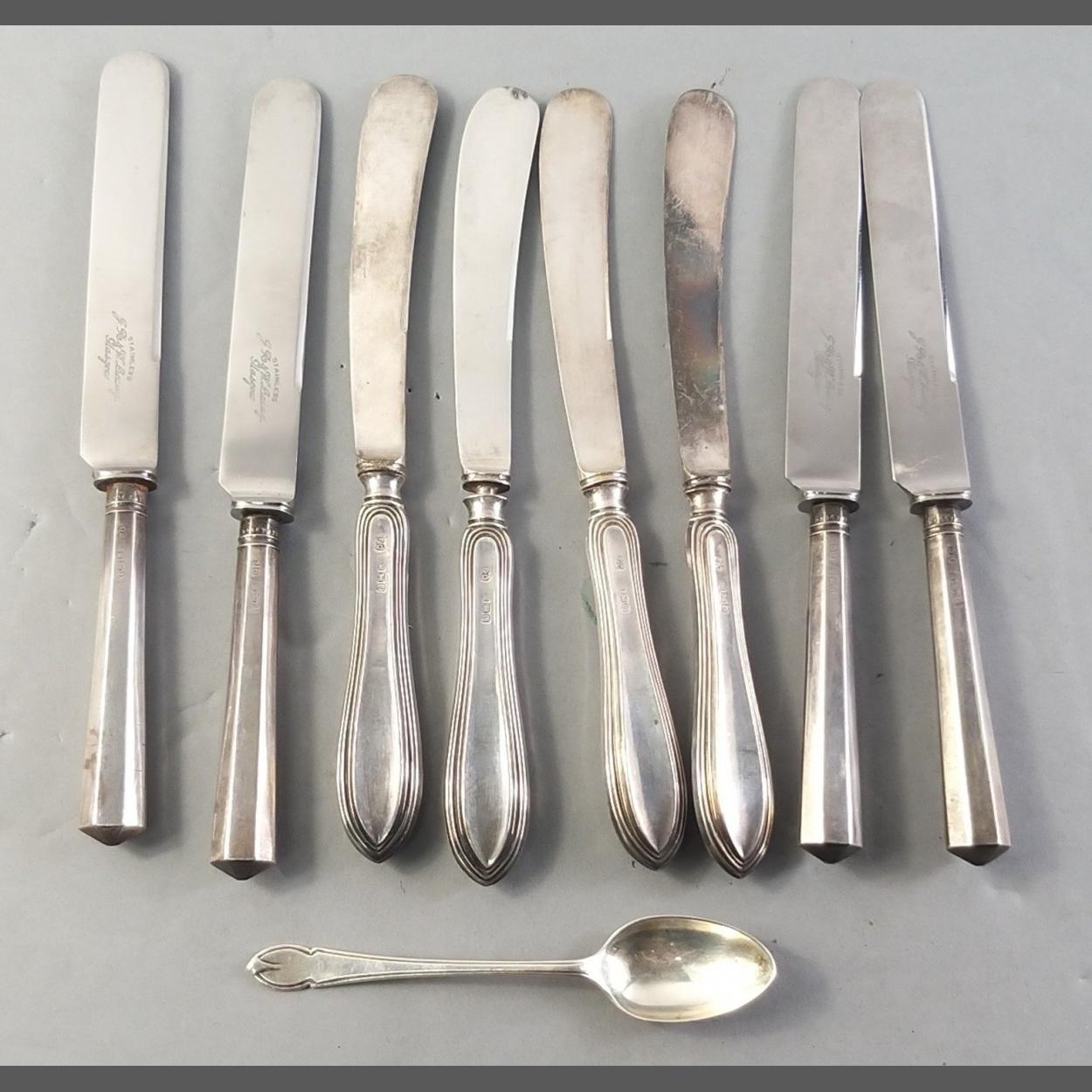 Eight silver handled (hallmarked) small butter knives (7cm handles) and a silver hallmarked teaspoon.