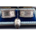 A gorgeous boxed set of two WALKER & HALL napkin rings in fitted dome top box. Hallmarks for 1902 Sheffield. Gross weight 69g approx. Comes with a Scottish hallmarked silver thistle finial teaspoon