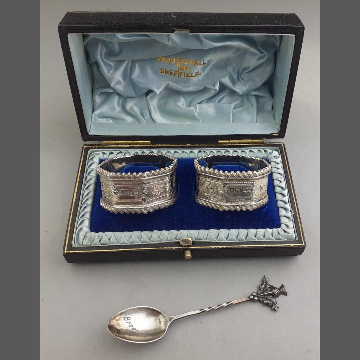 A gorgeous boxed set of two WALKER & HALL napkin rings in fitted dome top box. Hallmarks for 1902 Sheffield. Gross weight 69g approx. Comes with a Scottish hallmarked silver thistle finial teaspoon