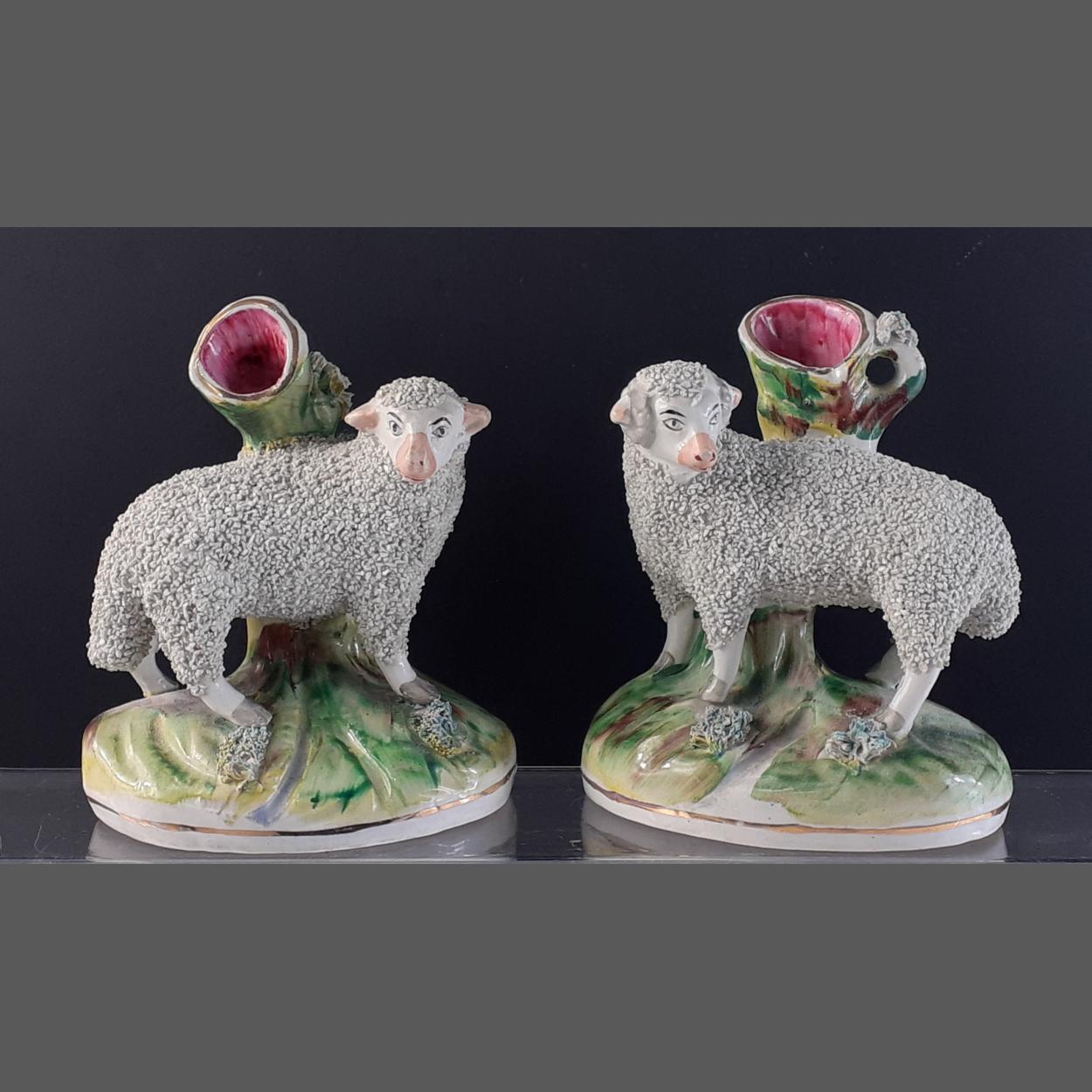 A pair of very appealing late Victorian pottery ram & ewe spill vases in very good clean undamaged condition, minor firing crack noted to one base. 12cm tall, 10cm wide approx. A very good example of the type.