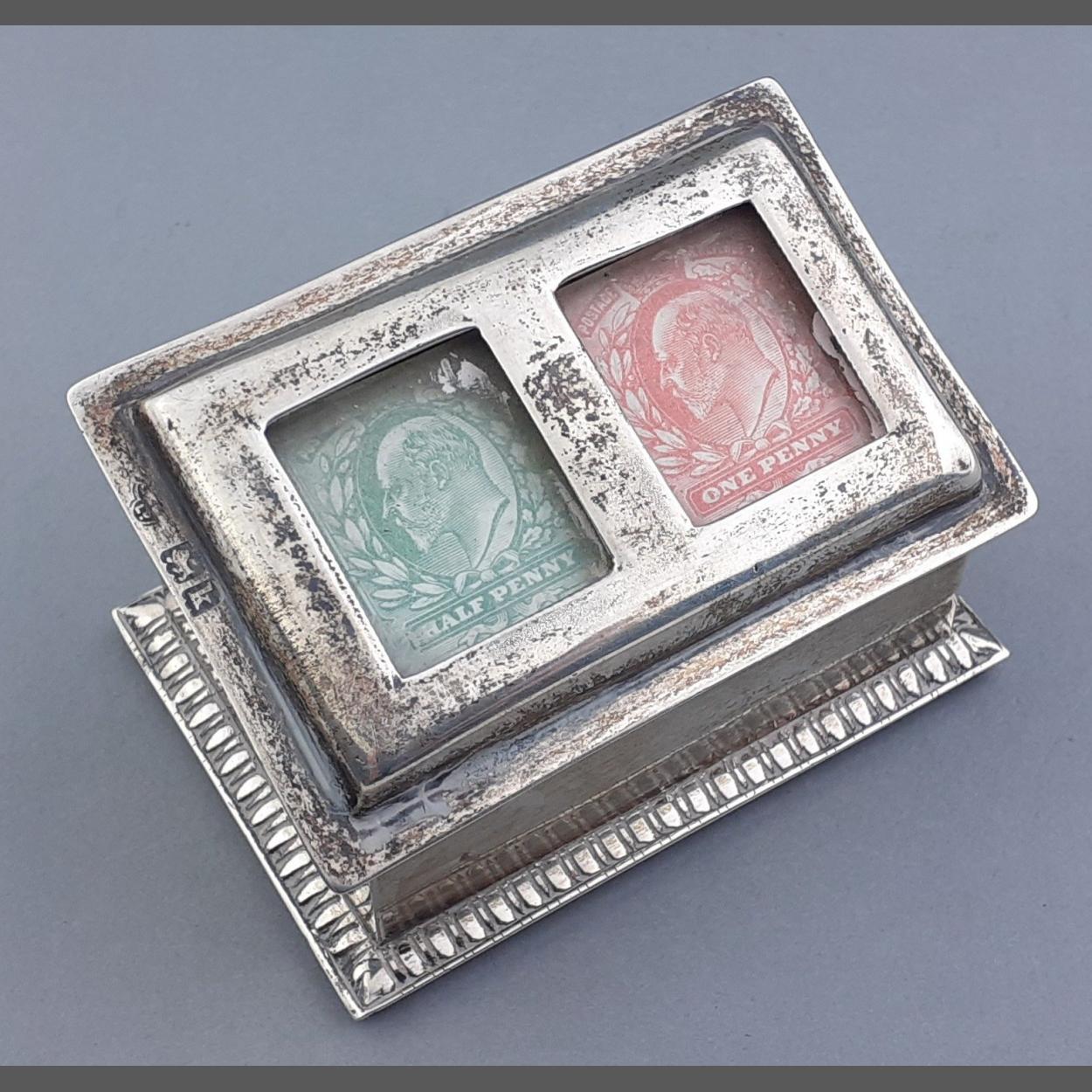 A very cute little sterling silver stamp holder. Hallmarks for London 1905. 6cm wide approx, gross weight 94.7g approx.