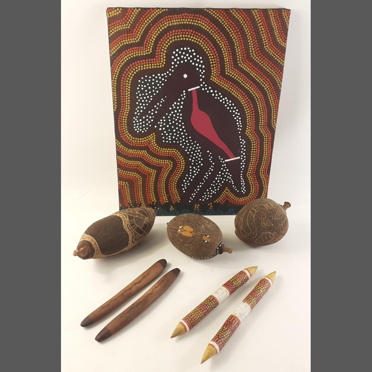Intriguing little lot of Australian Aboriginal pieces of interest to include three decorated Baobab Nuts and two pairs of decorated talking sticks. Also a rather attractive Brolga Aboriginal painting on canvas by GRAHAM FIREBRACE of Hastings, Victoria, Australia. 45 x 35cm approx.