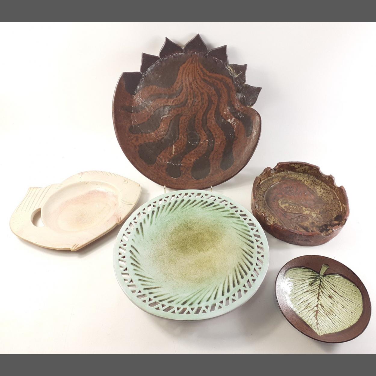 A super collection of five studio pottery dishes / platters. The largest (36cm) marked AR76. One shaped as a fish. Another by DAVID ALEXANDER. A super decorative and useful lot
