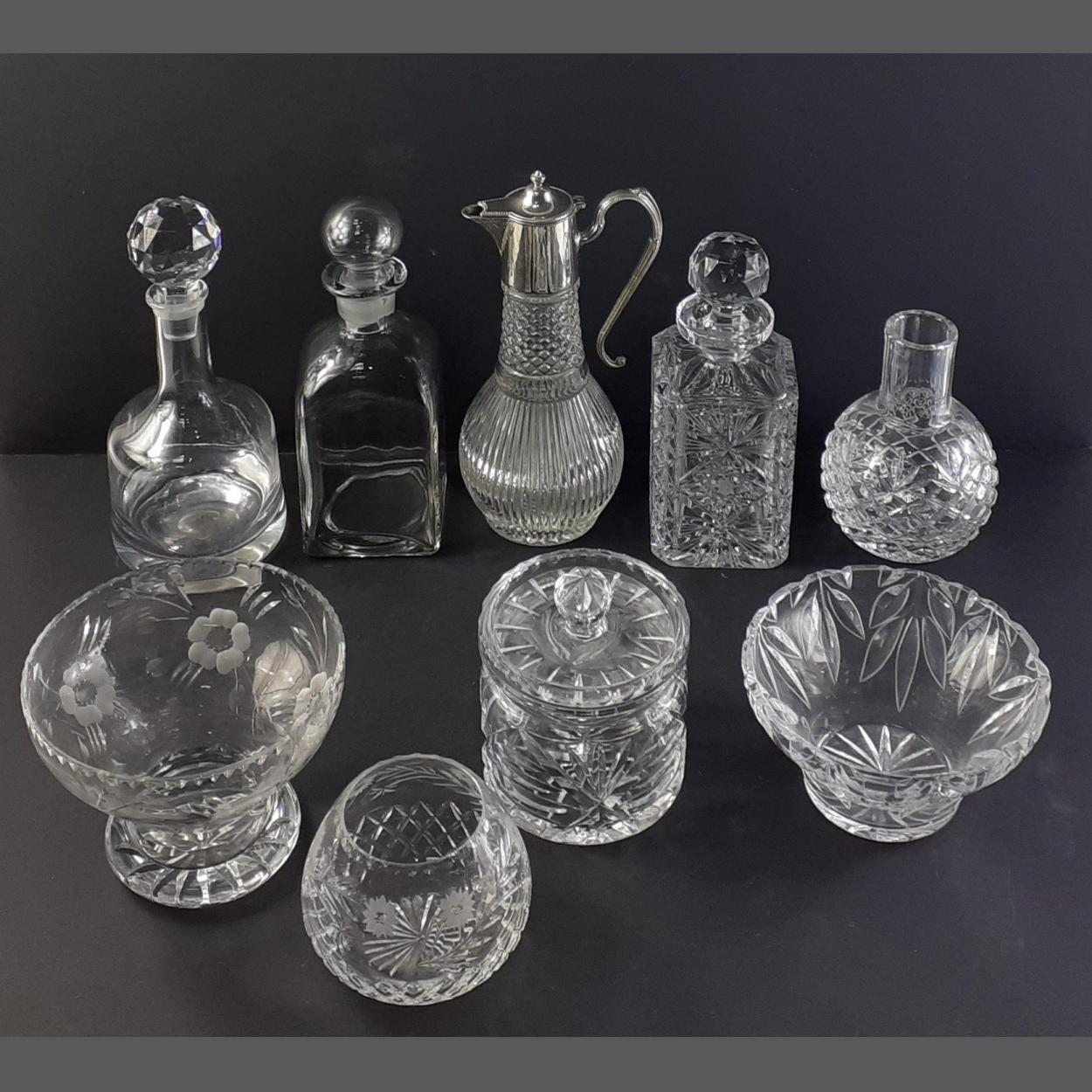 Good crystal and glassware lot to include three dishes, three decanters, claret jug and a lidded biscuit barrel.