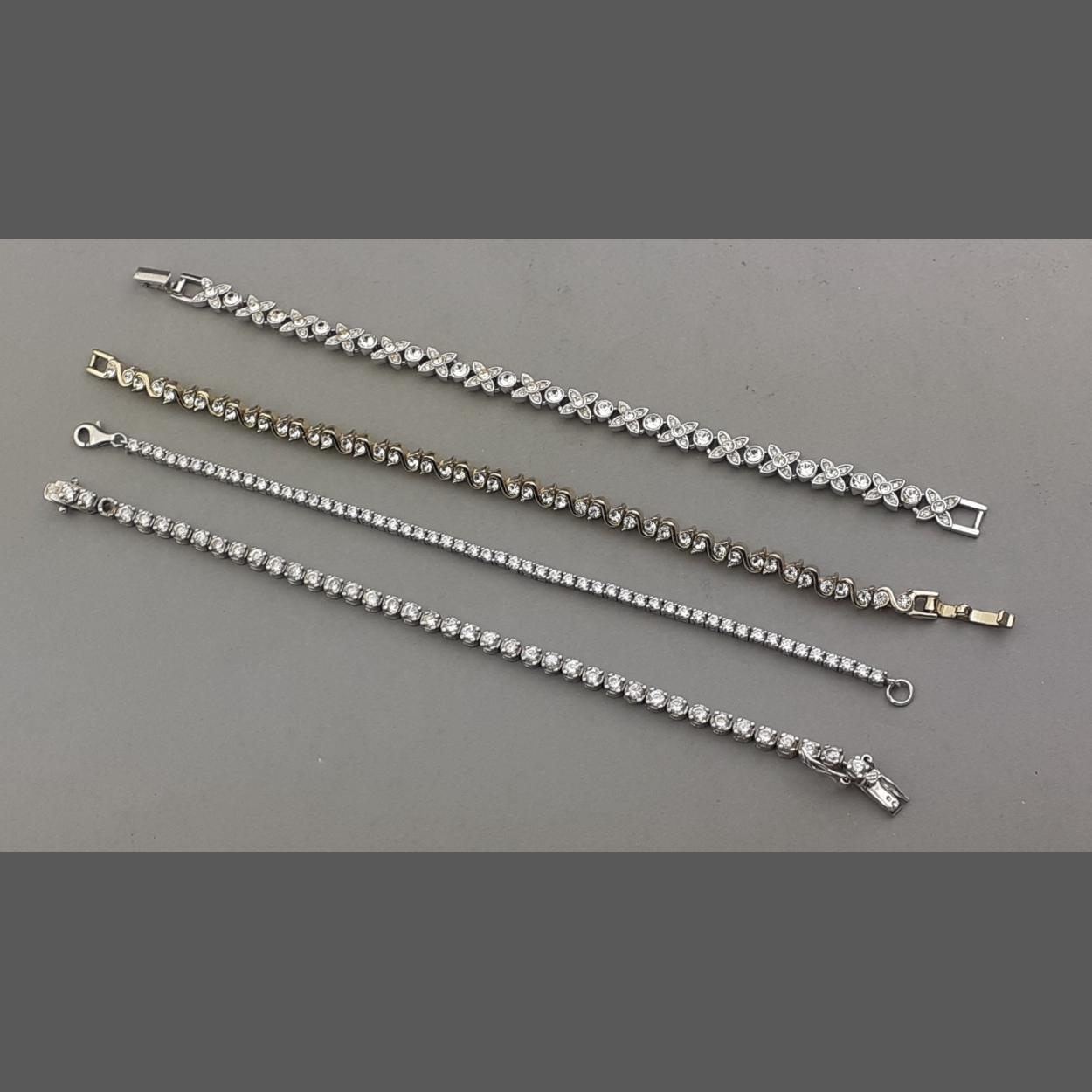 Four classy tennis style bracelets. One stamped 925, one gilt, one other 925 and one other with missing stone noted