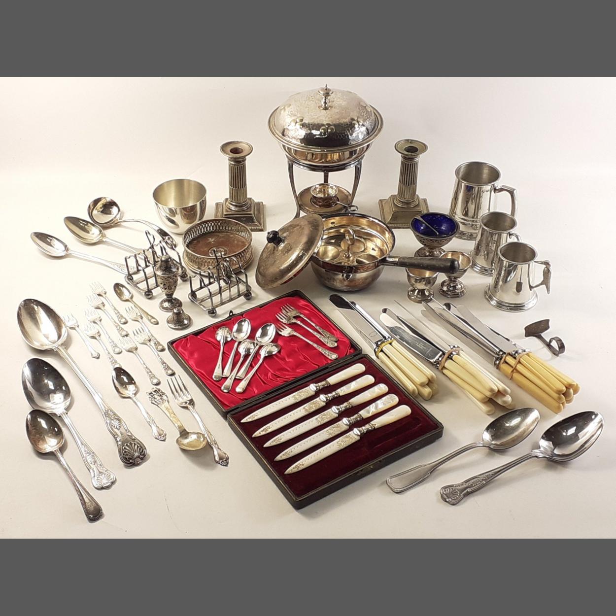 A lot comprising interesting silver plated items to include egg pan on stand, plated knives in box, squat column candlesticks, tankards, cutlery, salts, wine bottle holder, toast racks and others. A good lot.