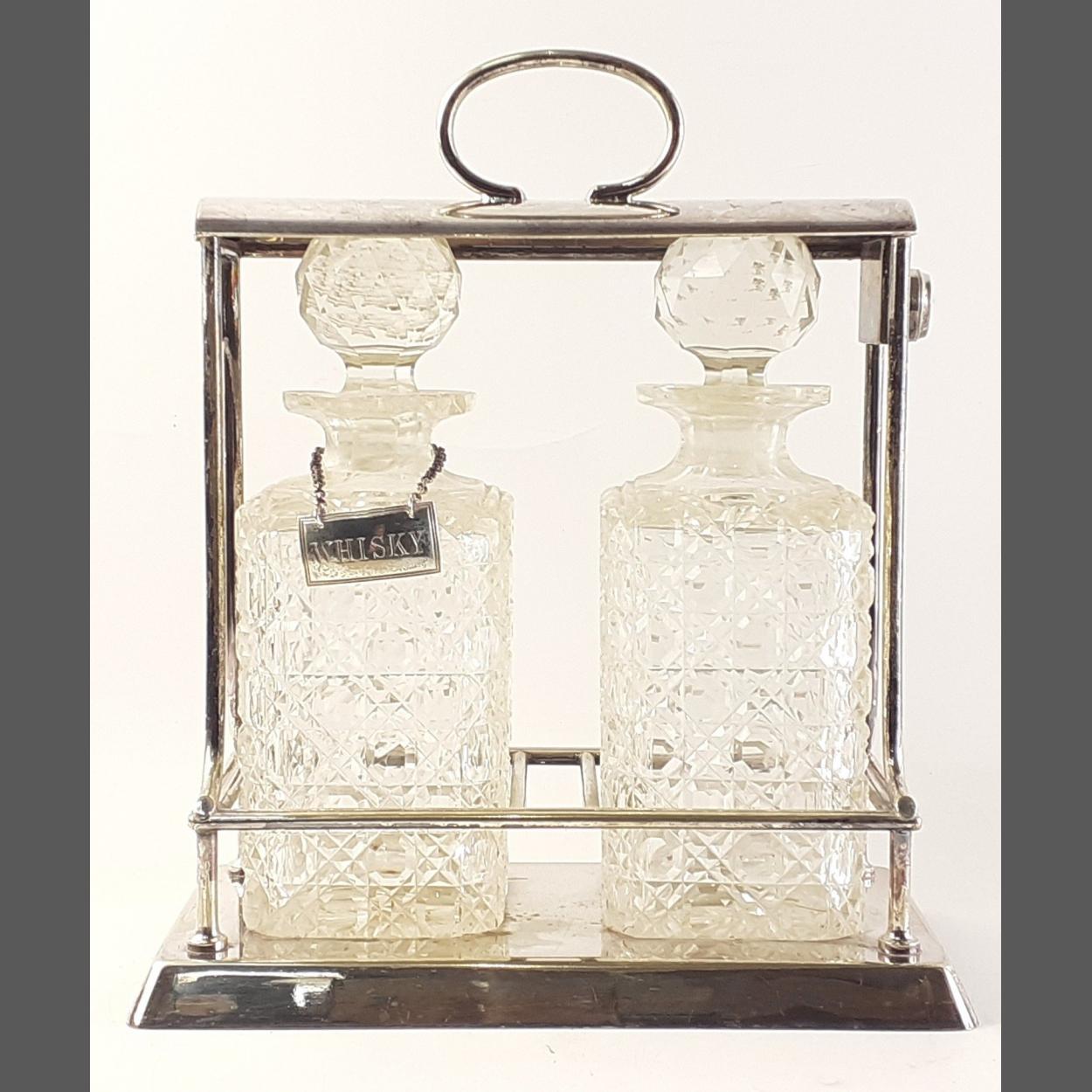 A silver plated TANTALUS with two decanters, neither with a label. Note the lid is locked and there is no key.