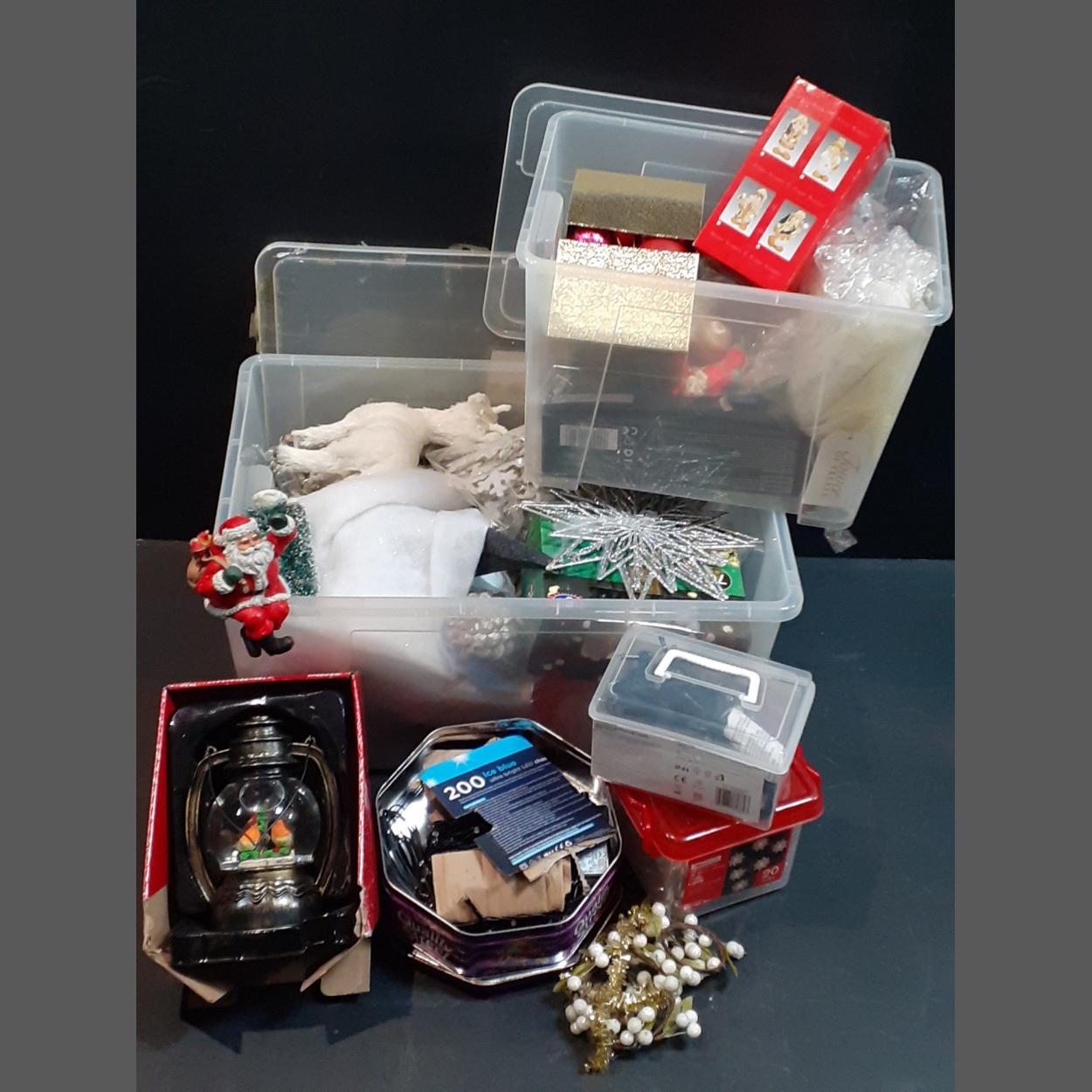 GET READY FOR SANTA Three boxes stuffed full of CHRISTMAS decorations, lights, baubles, and lots of small decorations. A handy lot.