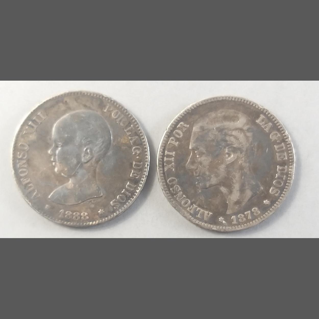 Two large Spanish coins of interest to include 1878 5 Pesetas and an 1888 5 Pesetas. Both dark but in generally good grade