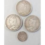 VICTORIA Coins of interest. 1889, 1980 Crowns, 1887 Double Florin and a GEORGE III shilling with wear