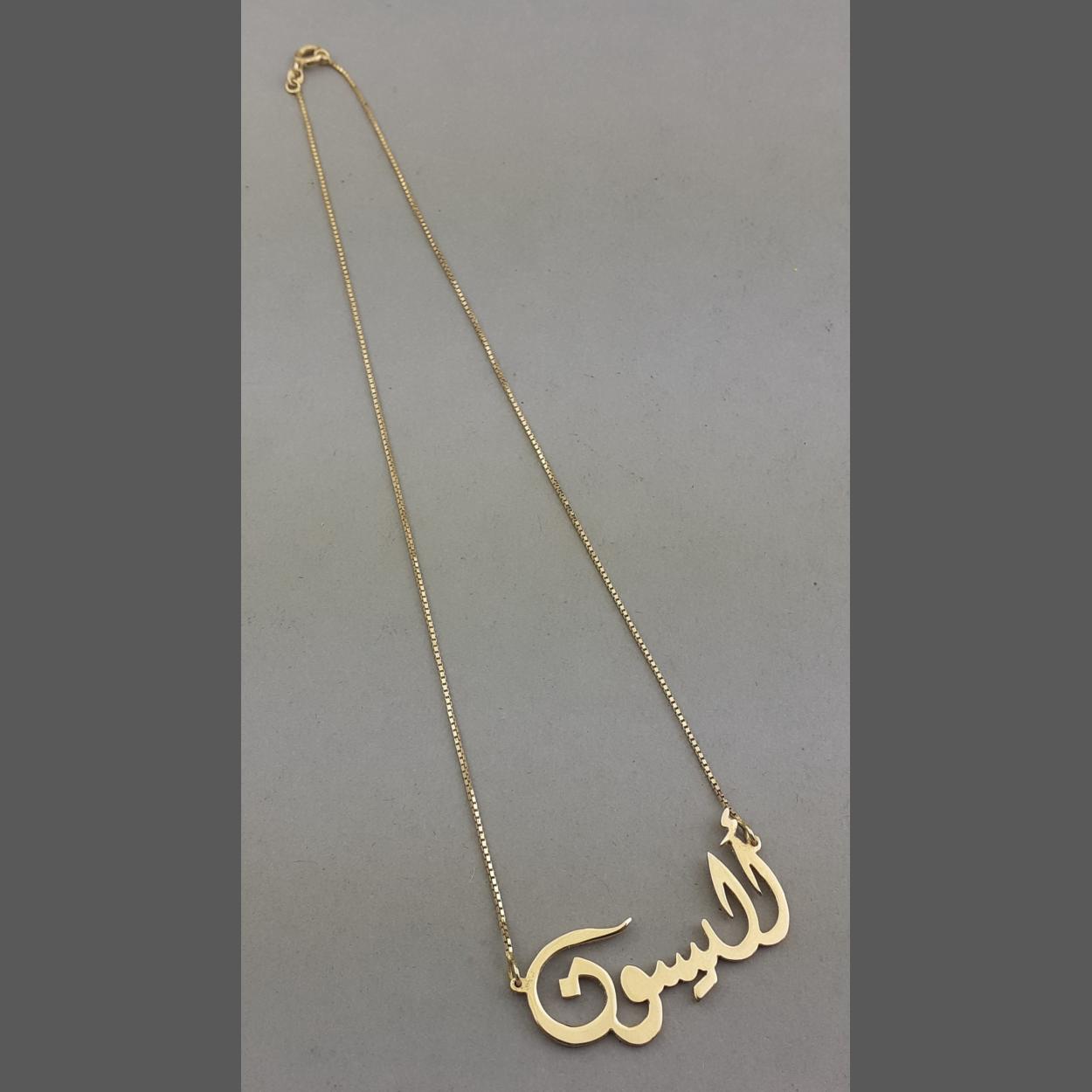 Bought in Dubai, a 9ct stamped chain (jeweller tested) attached to an Arabic script name necklace (Alison) jeweller tested as 18ct, weight 6g approx
