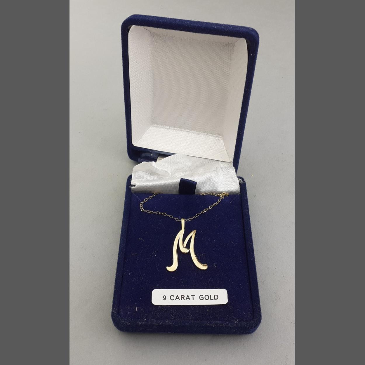 A 9ct marked chain, 40cm long approx with an 'M' initial. Weight 1.3g approx