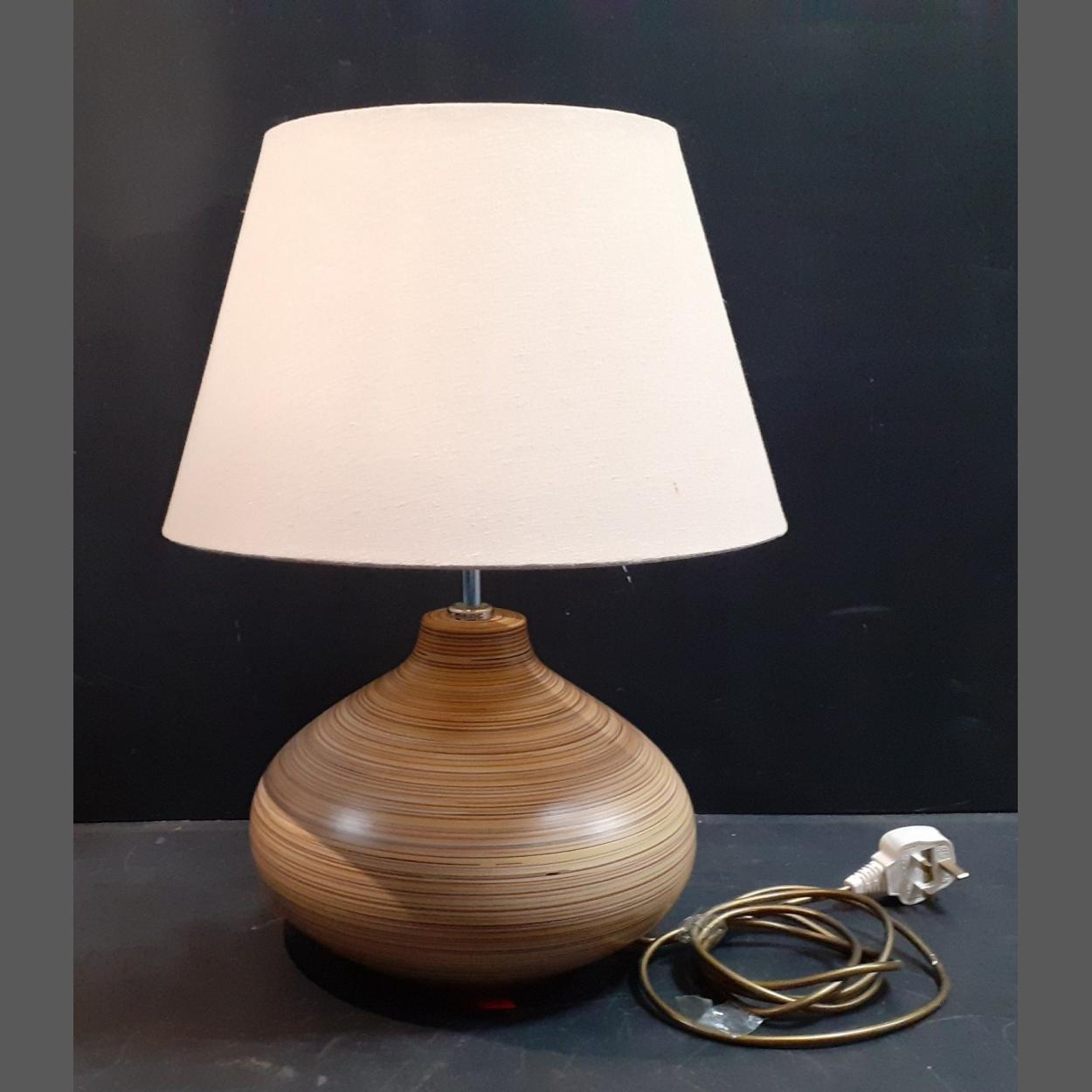 A bulbous striped base table lamp with shade, 48cm approx to top of shade.