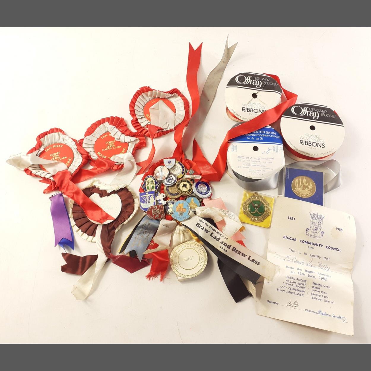 BIGGAR MARCH RIDING interest. A quantity of rosettes on with more than 10 local Borders festival enamel badges.