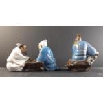 A super pair of Mud Men style Oriental ceramic figures. One featuring two figures at a classic Chinese board game and one of a gent with a goose. The pair 20cm approx and the other 15cm high. Both in good order with no damage.
