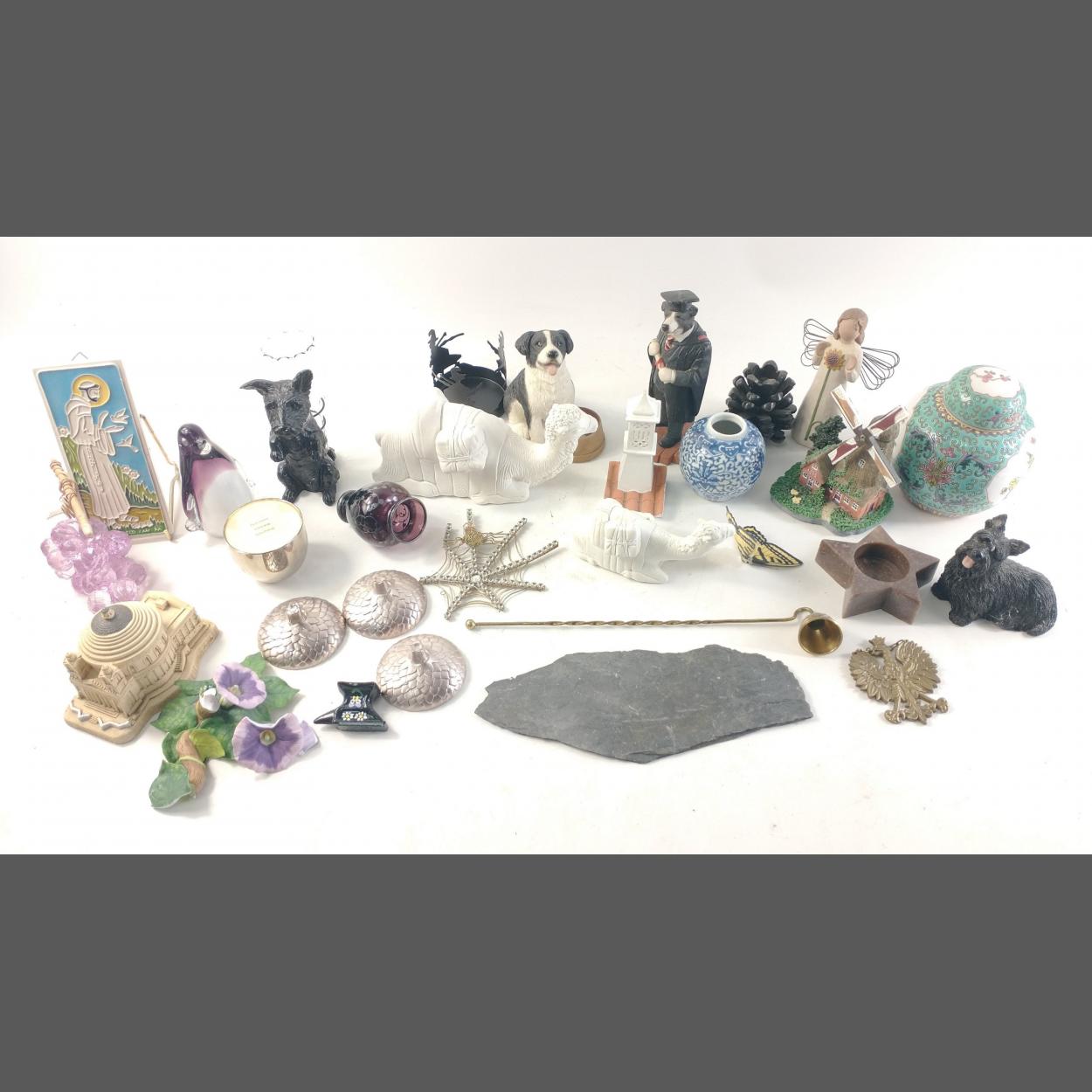 A mixed box to include candles, decorative ceramics, glass penguin paperweight