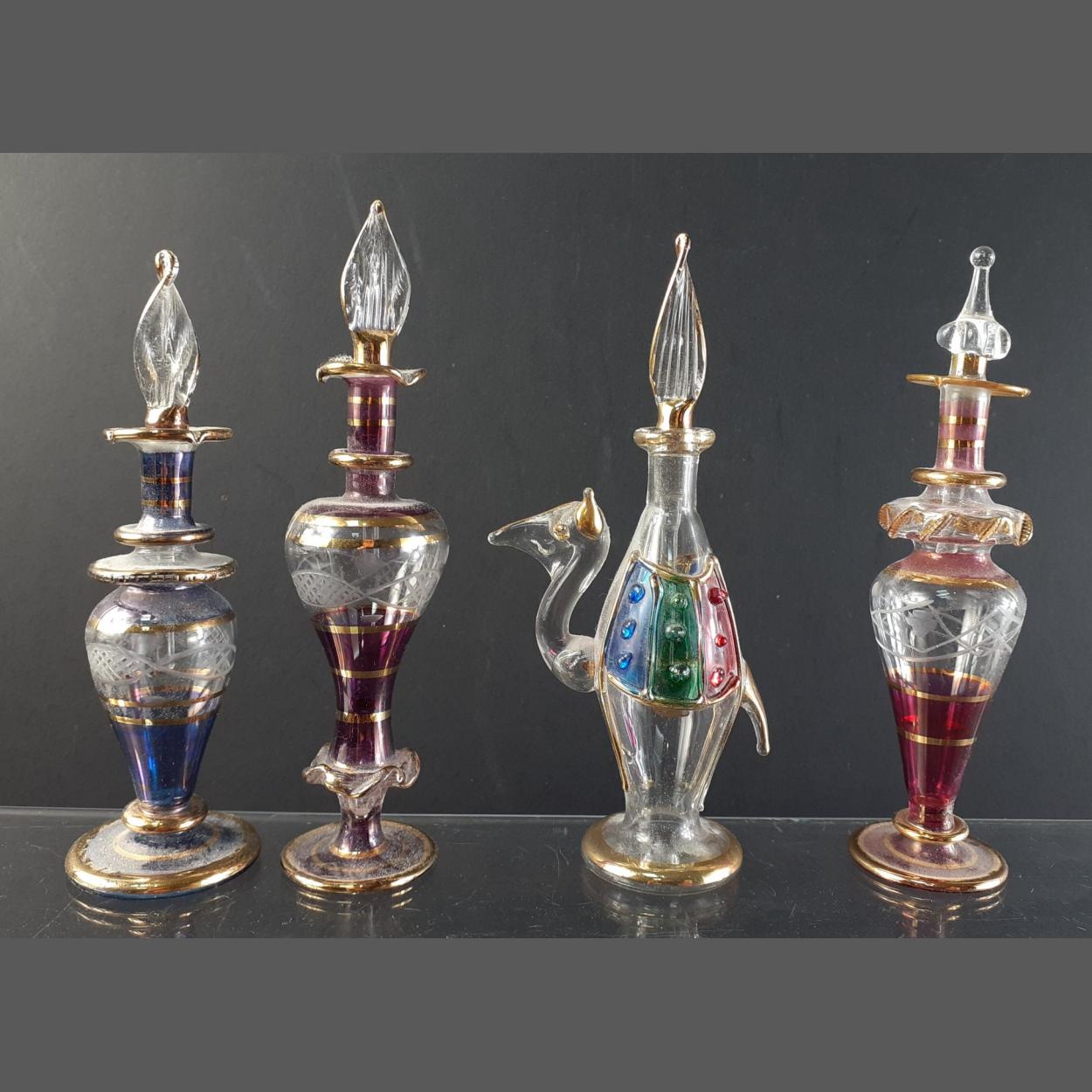 EXQUISITE! Four Egyptian glass perfume bottles, the largest camel-shaped one stands 12cm approx