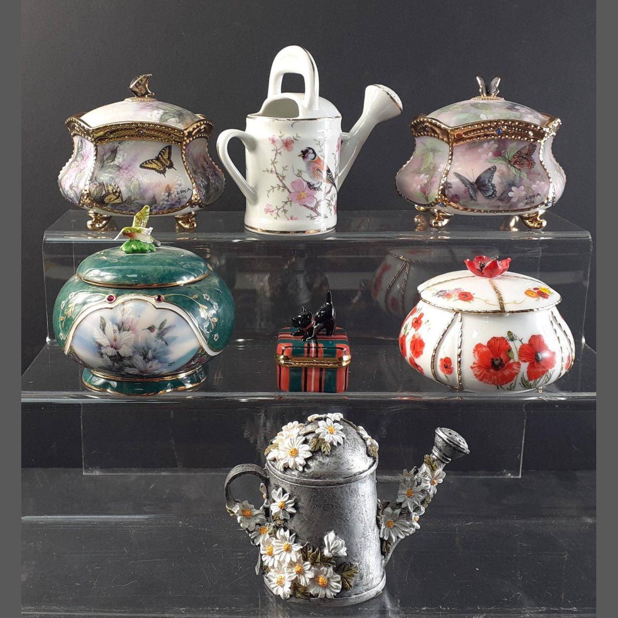 A super small decorative collection to include ARDLEIGH ELLIOTT trinket boxes, one bird with damage to wing, two water cans and others.