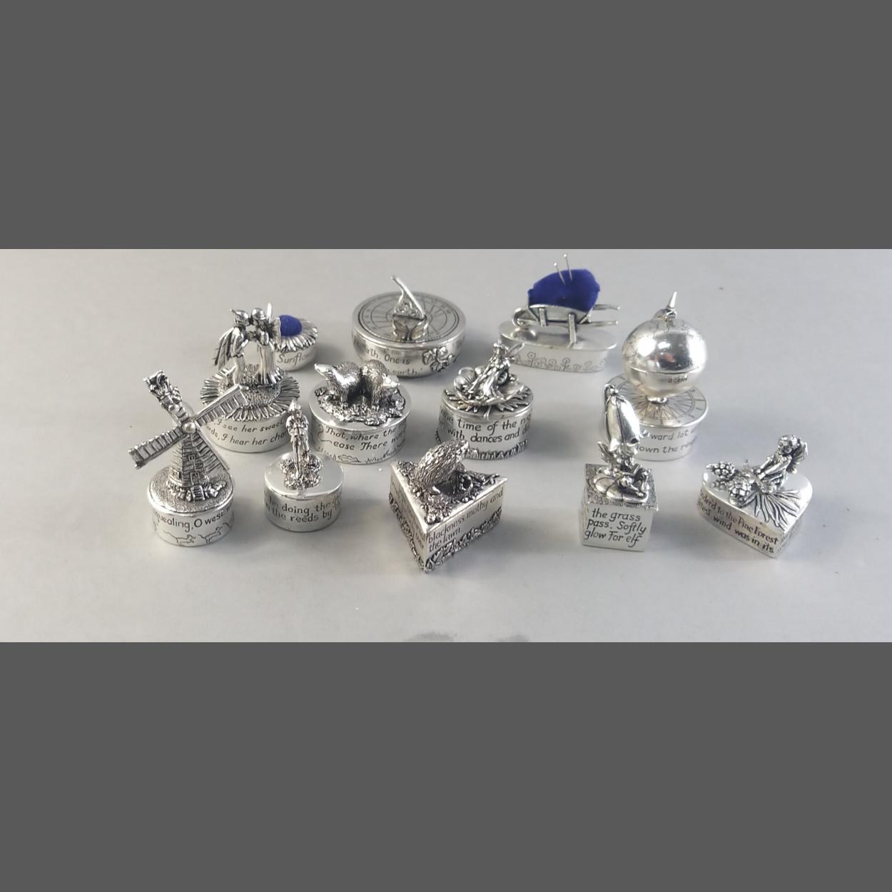 A super collection of twelve small silver plated 'Made in Wales' lidded pill boxes depicting fairies, pixies, animals, windmill and others. All in good complete condition.
