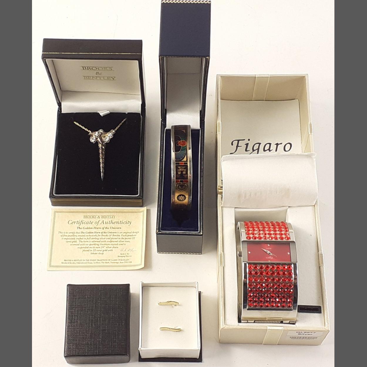 Quality jewellery lot to include FIGARO Italian design bracelet watch, BROOKS & BENTLEY 925 Stamped Unicorn Pendant, 925 stamped earrings and BROOKS & BENTLEY gorgeous Egyptian style bracelet and ring