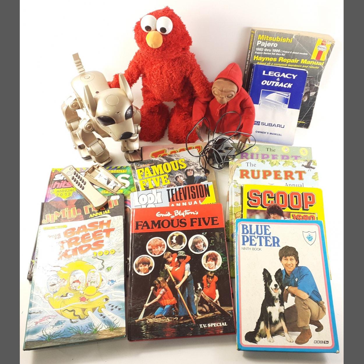 A box of annuals and toys, to include Robot Dog with remote controller, battery powered ELMO, battery powered ET and a selection of annuals to include Beanos, Famous Five, Rupert etc, mostly 1970s.