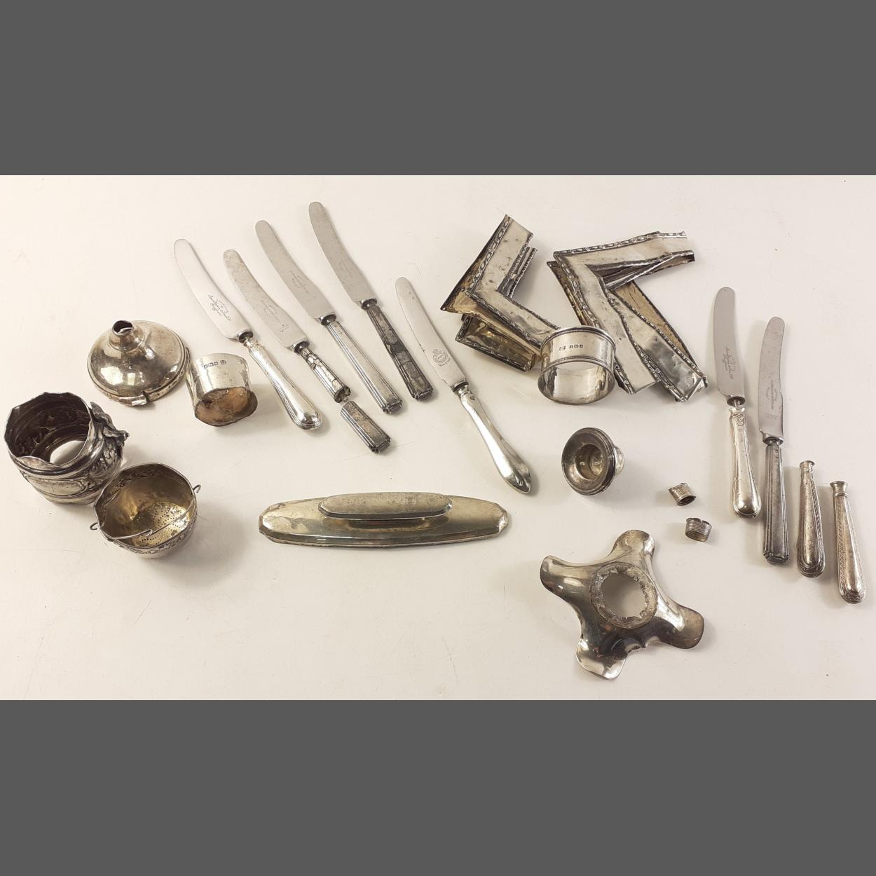 A small collection of broken and parts of hallmarked silver items weighing 100g approx. Lot includes another 100g of unmarked white metal and silver handled knives