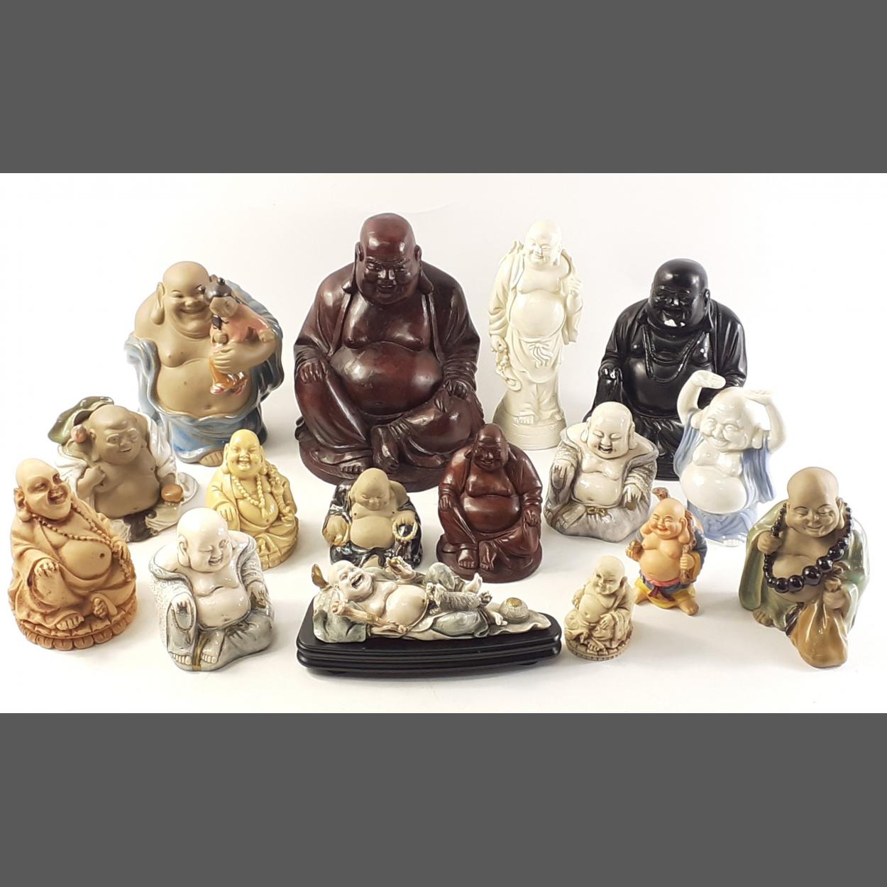 BUDDHA lot! comprising a group of wooden and ceramic models. Interesting lot with some very appealing models. The largest 22cm approx.