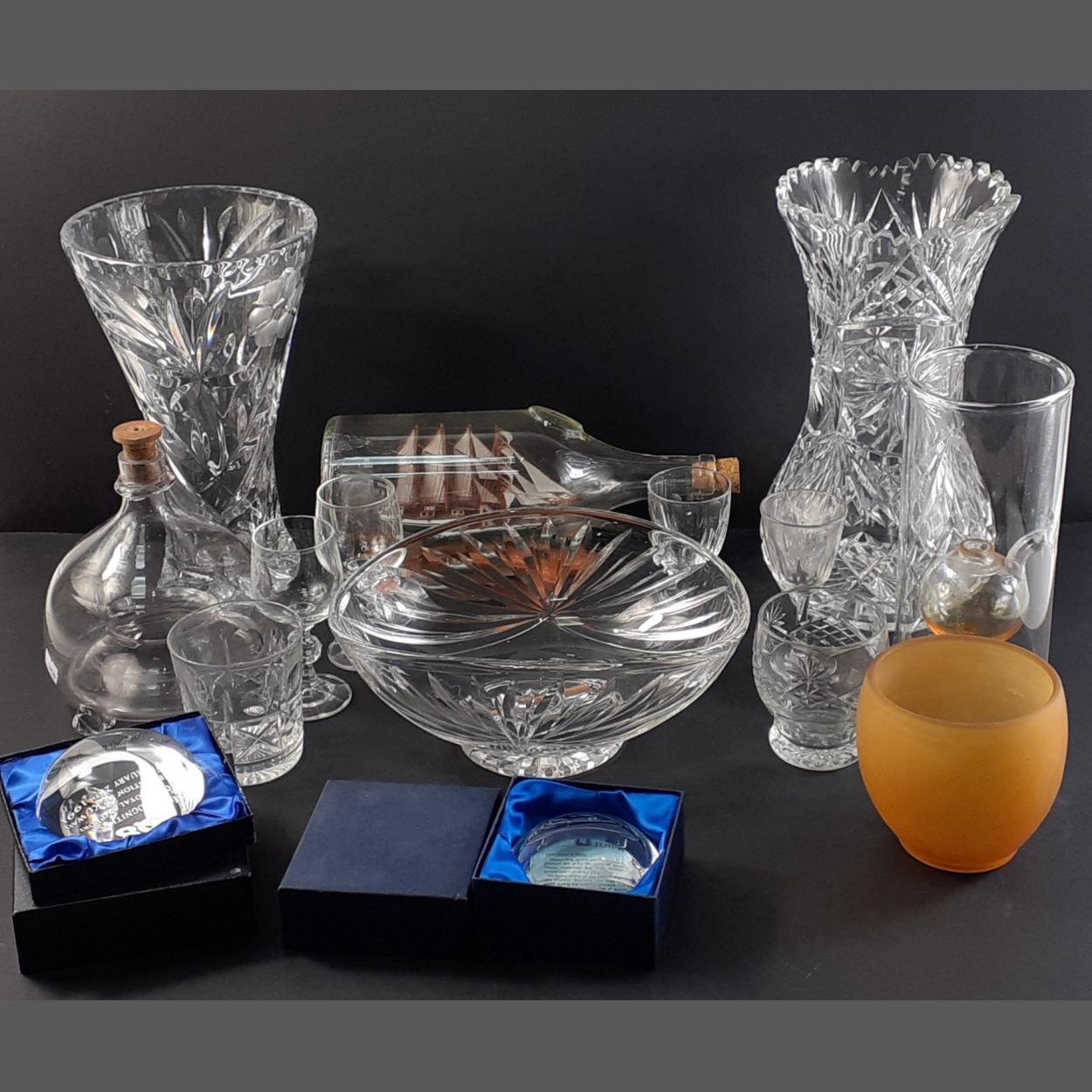 A good collection of glassware to include useful bowl, paperweights, useful glasses, two large crystal flower vases.
