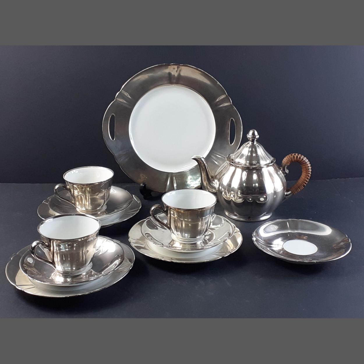 Attractive three piece tea service marked 'STERLING SILVER ON PORCELAIN' comprising 15cm teapot, sandwich plate, cups and saucers. Interesting, stylish and unusual.