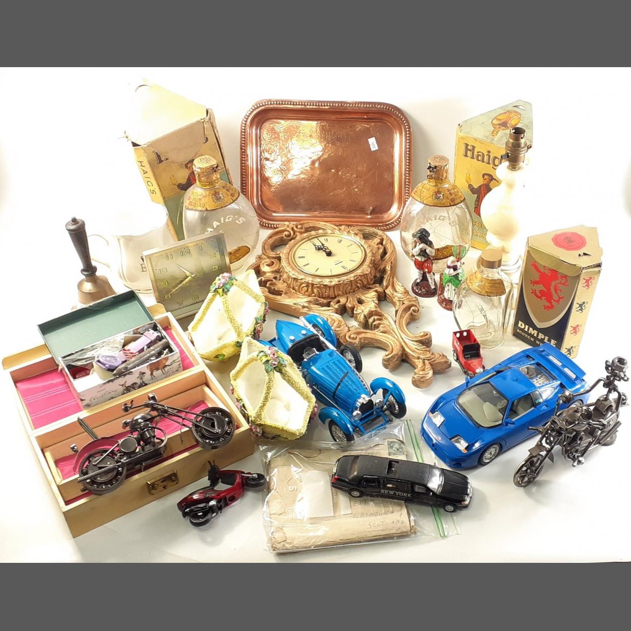 A mixed lot of decorative a household items to include onyx table lamp, heavily gilded Smiths wall clock (no glass), one other modern mantle clock, copper tray, modern metalwork motorbike ornaments, hand bell, diecast cars, two empty HAIG DIMPLE empty bottles in boxes, Kensington antique basket vases and others